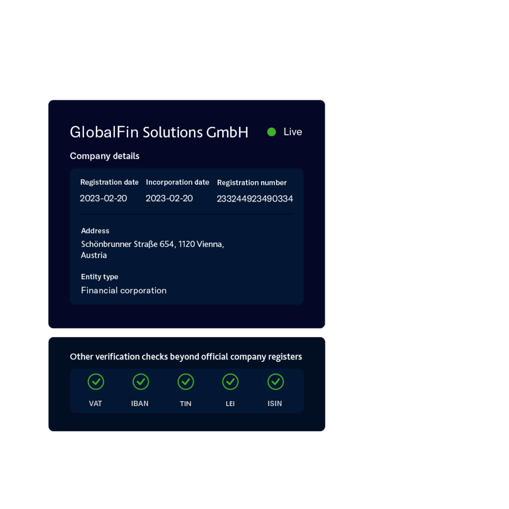 Access original data and documentation on more than 328 million companies. Add our KYB applications to your existing stack and ensure compliance processes use data that is retrieved exclusively from the primary source.